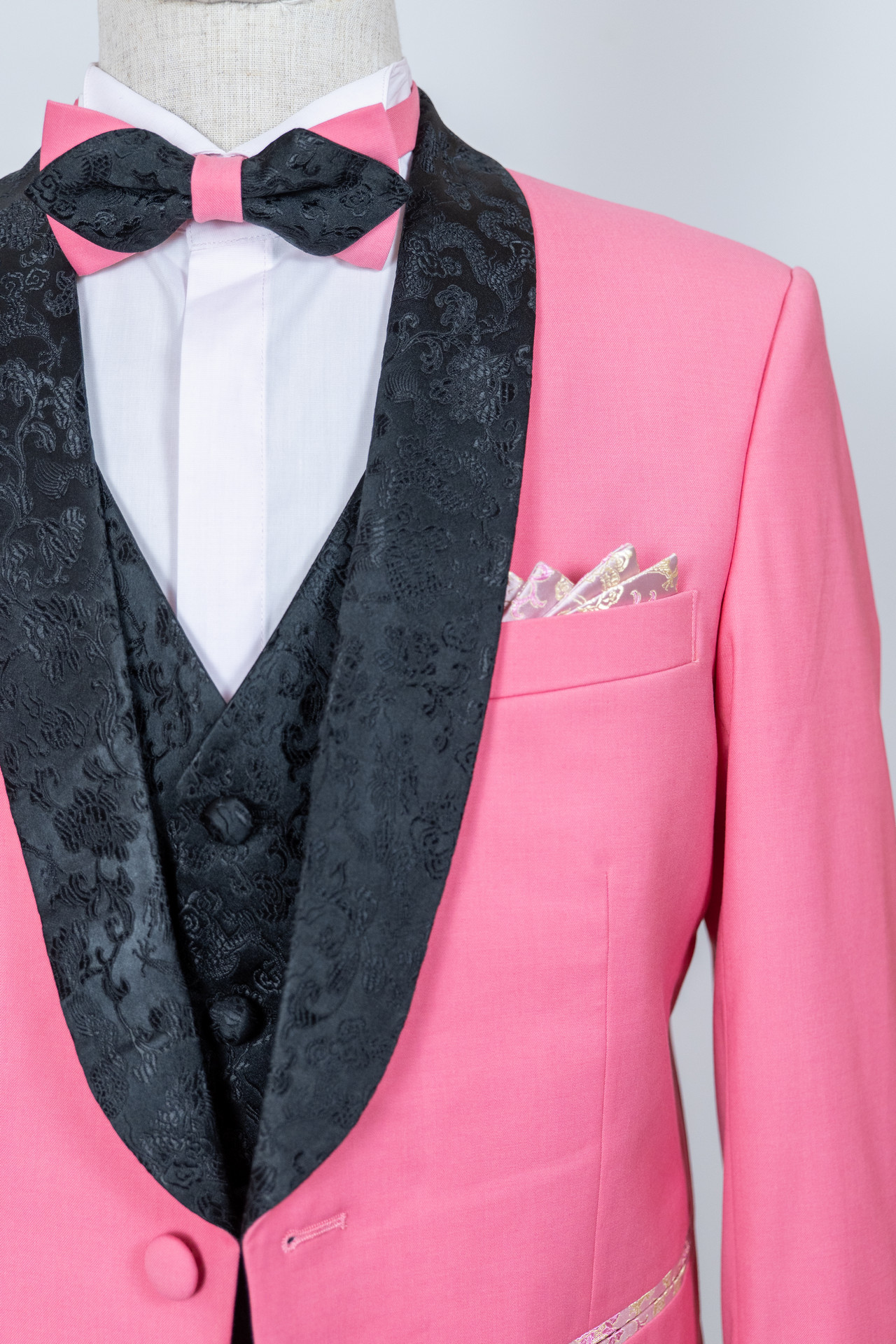 Porter un costume rose cérémonie à col à motif damassé noir est une déclaration audacieuse et élégante. Pour équilibrer l’éclat du rose, choisissez une chemise dans des tons neutres comme le blanc, rose pâle, le noir ou même un gris clair, ce qui permettra au col à motif damassé noir de se démarquer subtilement. Ensuite complétez le look avec des accessoires sobres. Une cravate noire ou grise ou un nœud papillon dans les mêmes tons, des boutons de manchette discrets, et des chaussures noires classiques pour ne pas surcharger l’ensemble. Pour les occasions plus décontractées, vous pouvez opter pour une paire de sneakers blanches stylées et une chemise sans cravate. Ce qui ajoutera une touche de modernité à votre tenue. L’important est de porter ce costume avec confiance, car c’est votre assurance qui fera toute la différence.