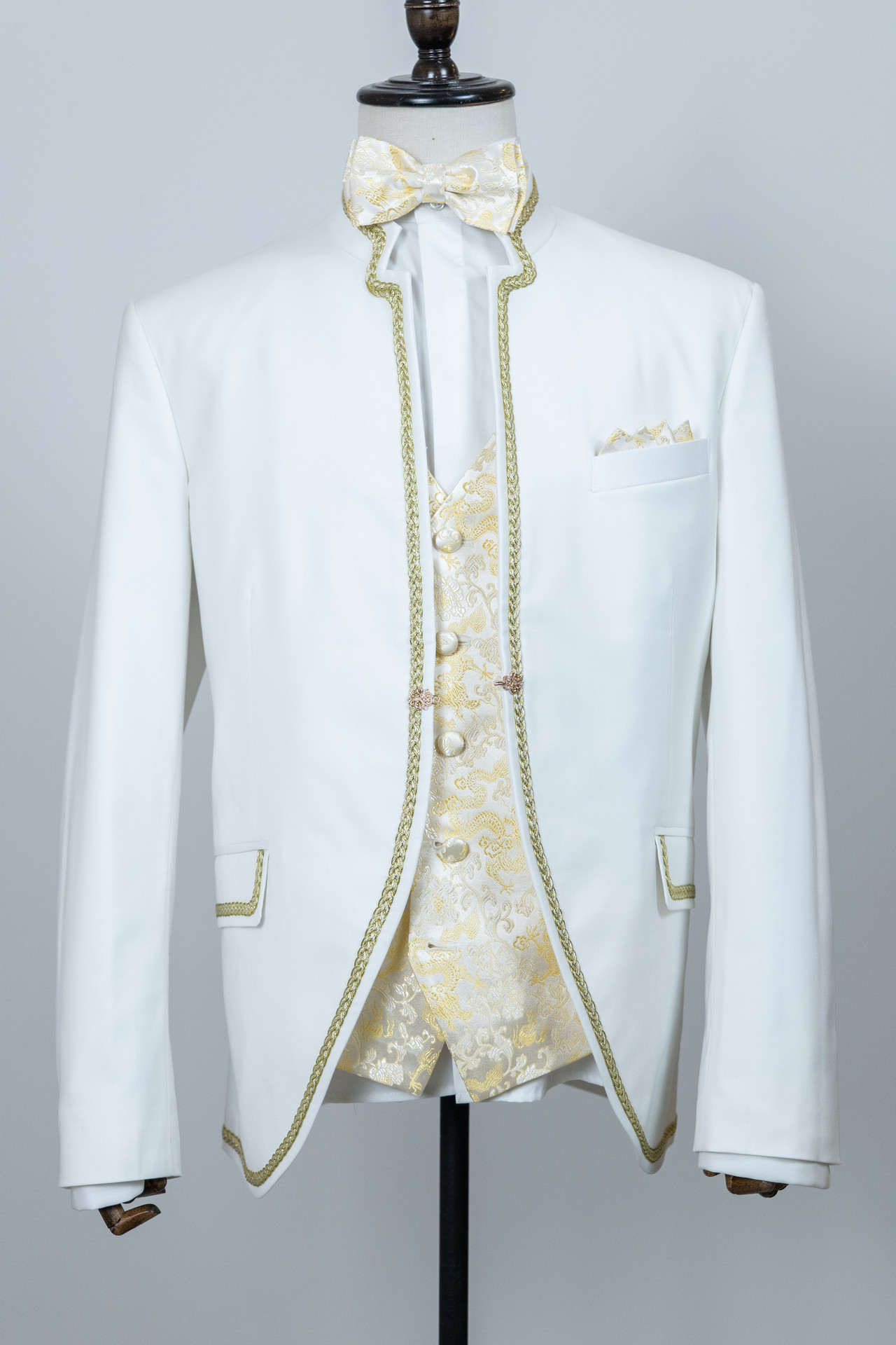 Pour porter une veste de costume blanche à liseré doré avec élégance lors d’une cérémonie, il est essentiel de privilégier la simplicité et l’harmonie des détails. Choisissez une chemise de couleur neutre, comme le blanc ou une teinte pastel discrète, afin que la veste reste le point focal de votre tenue. Assurez vous que la veste est parfaitement ajustée : elle doit épouser vos épaules et la taille sans plis, tout en permettant une liberté de mouvement.