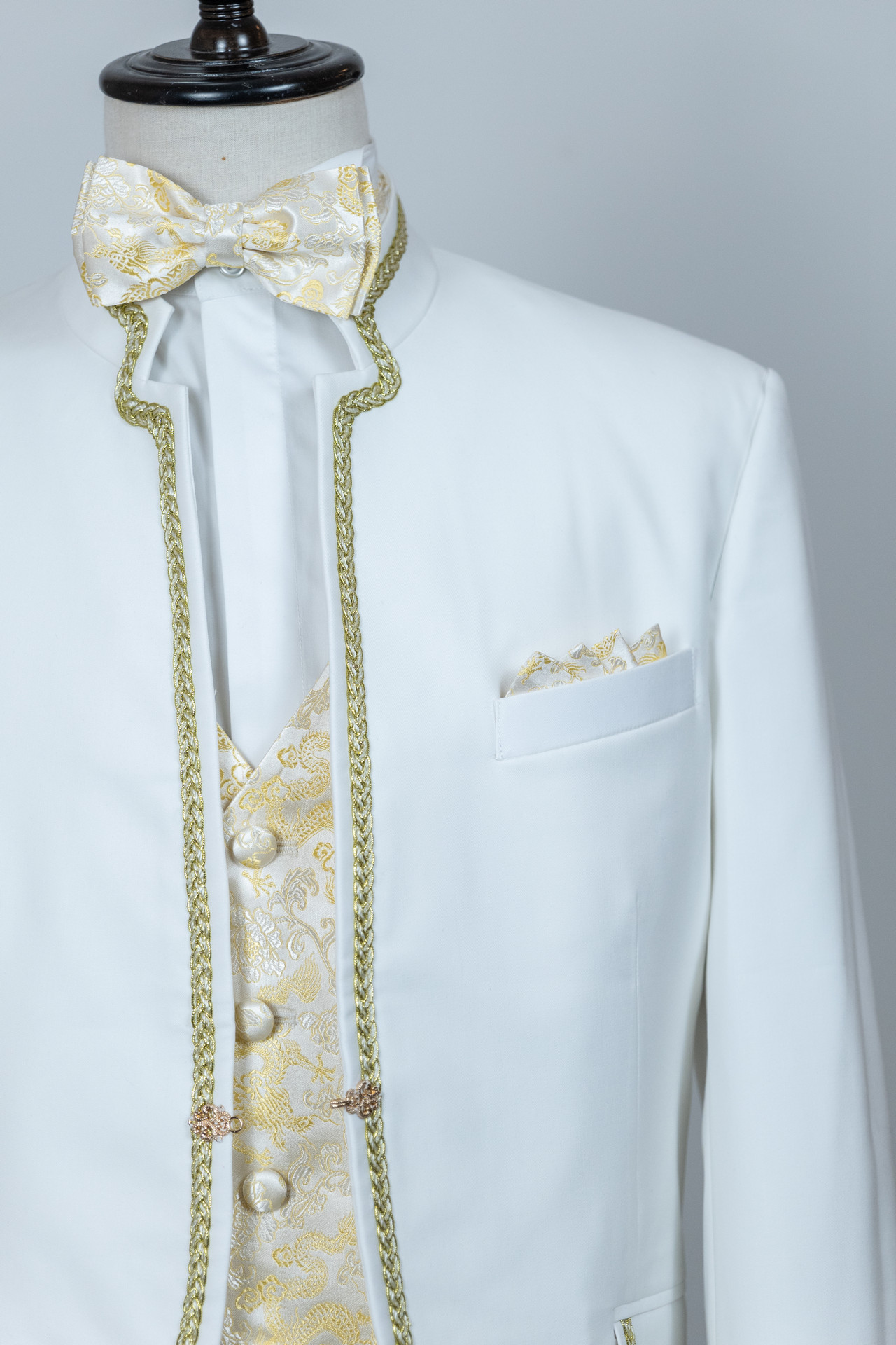 - Veste de costume : Veste doublée et entoilée avec col mao, détails liserés dorés sur le bord de la veste, et fermoir métallique,1 poche de poitrine sur la veste, 2 poches rabats, 3 poches intérieures, 1 fente d’aisance au dos